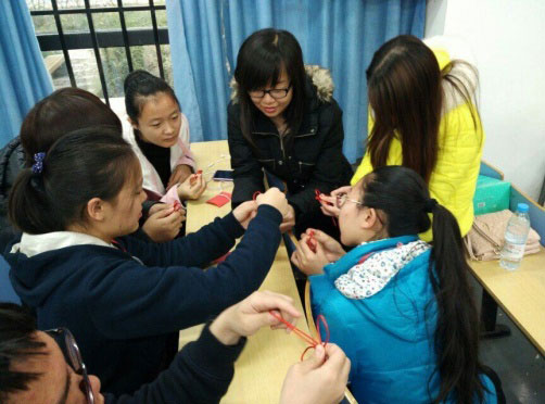 为表达中国学生对国际学生的热烈欢迎和美好祝愿,志愿者们还教授大家编制象征着和谐、团结的中国结。这期间,志愿者一遍又一遍的耐心讲解,手把手教授,使大多数同学都学会了编制吉祥结,传授结束后,大家看着自己手中的成品,都开心的笑了。