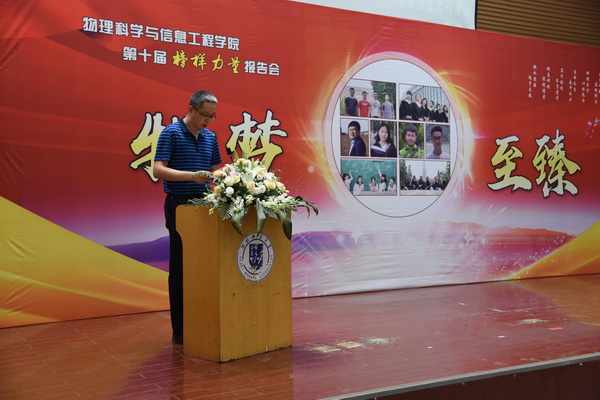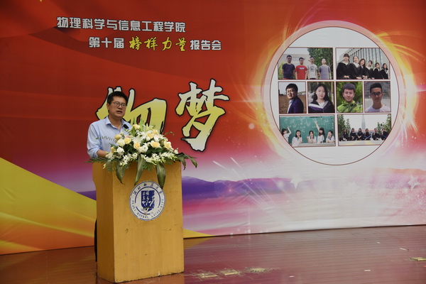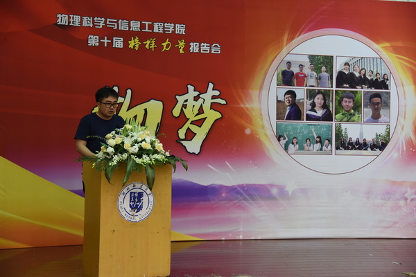 本届榜样力量报告会以“物梦至臻”为主题,凝聚了六位在平凡中追逐梦想,缔造辉煌的榜样人物。臻于至善的张朴婧,身为学院团委副书记,在恪尽职守的同时勤奋学习,以优异成绩考入了首都师范大学并获得硕博连读资格;酌水知源的维吾尔族学生肉孜麦麦提•吐送托乎提,情系桑梓,心怀家乡,利用寒假在家乡义务支教,用爱点燃了青春;亲躬亲为的张先洲,响应国家号召,担任大学生村官,将自己的青春年华与聪明才智无怨无悔地奉献给了国家最基层脱贫事业;格物致知的研究生王喜,砥砺前行,致力于科学前沿的课题研究,发表高水平科研论文,做研思笃行的实践者,以优异成绩考取北京理工大学博士研究生;攻坚克难的创新创业团队,秉承物理人永不服输的精神,携手共进,通过多个杰出的项目成果成功实现创业梦想;以梦为马,不负韶华的考研宿舍,并肩作战,风雨同行,共同追梦,创造了三个宿舍全部考研的神话。