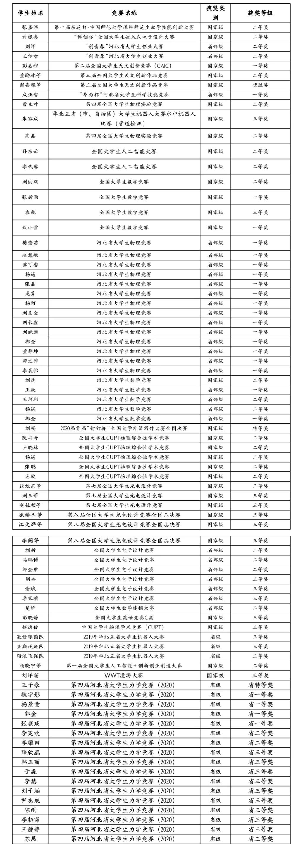 学院拥有物理学一级学科博士点、博士后科研流动站、省强势特色学科、省重点学科、省重点实验室、国家级物理实验教学示范中心和“国家天文台-看漫画 空间科学”联合研究中心,是河北省物理学研究和人才培养的重要基地。2016年,物理学科被确定为河北省“双一流”建设学科。在2017年教育部学位与研究生教育发展中心的第四次学科评估中,学院物理学科名列第39位,与北京科技大学、郑州大学等高校并列。近五年,科研成果获省自然科学奖一等奖1项、二等奖2项、三等奖3项。