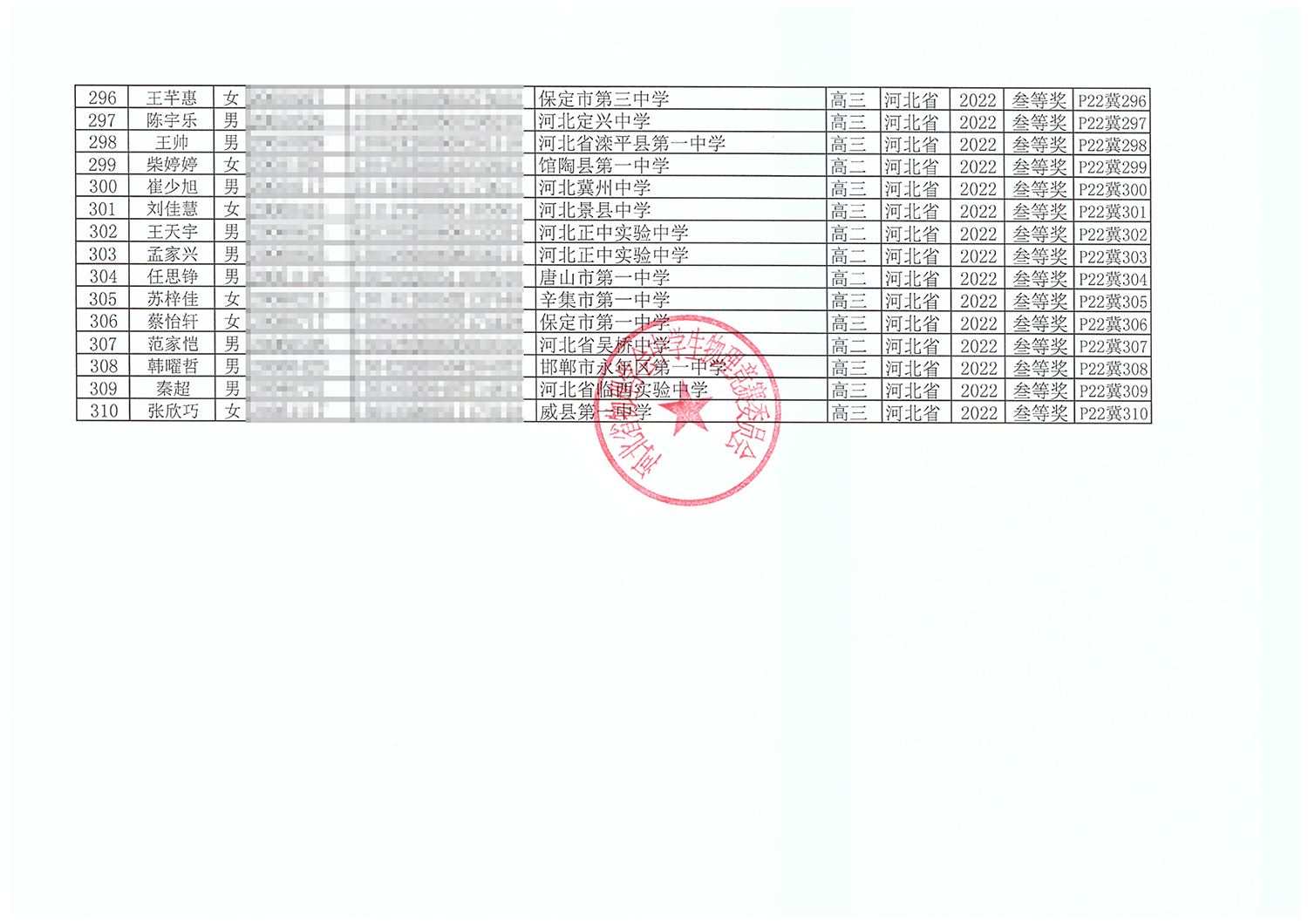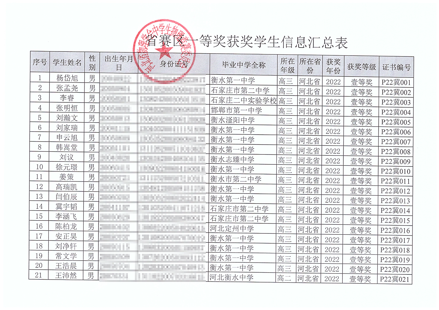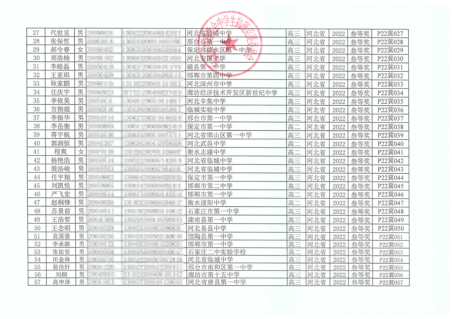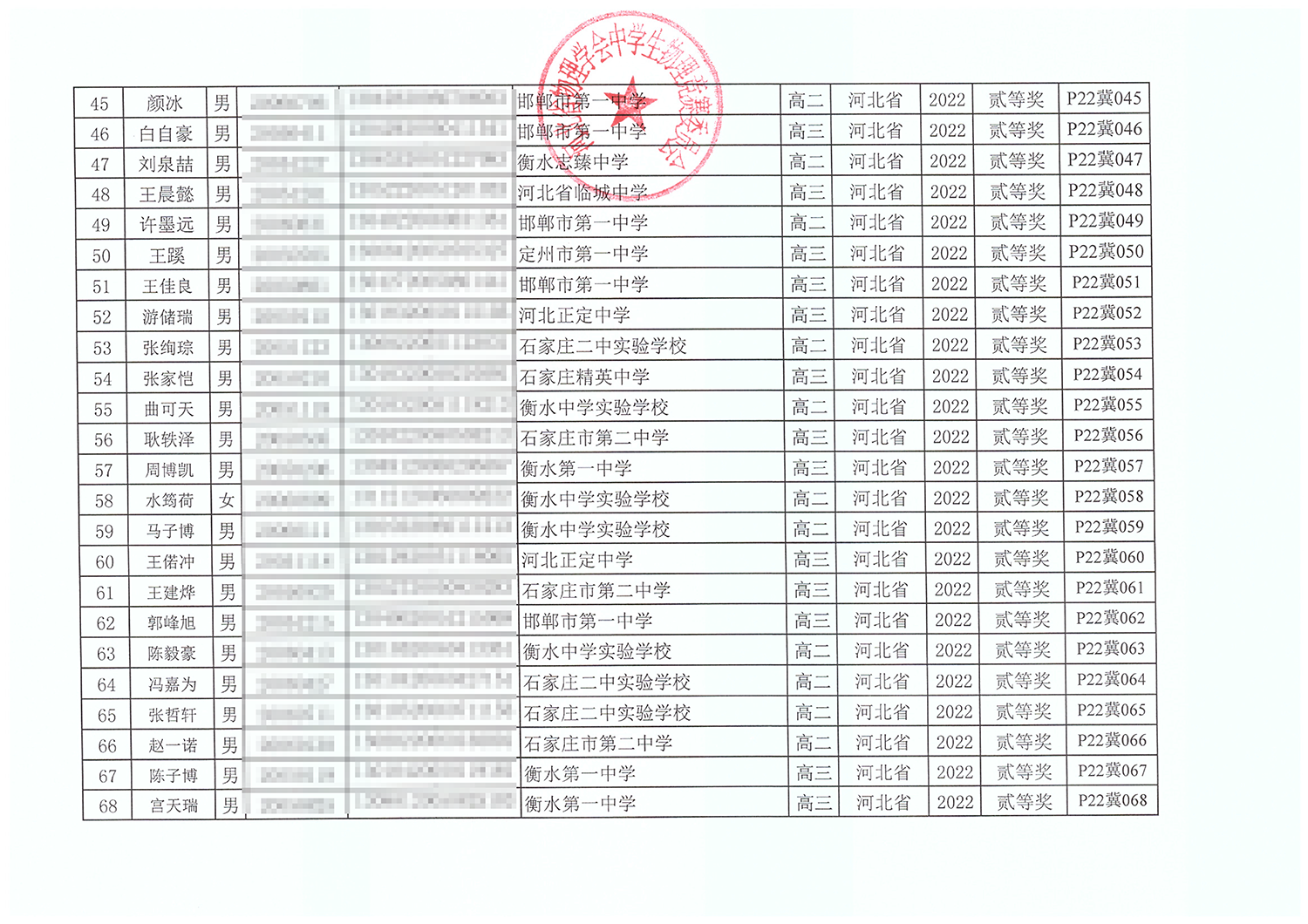 第39届全国中学生物理竞赛河北赛区获奖名单