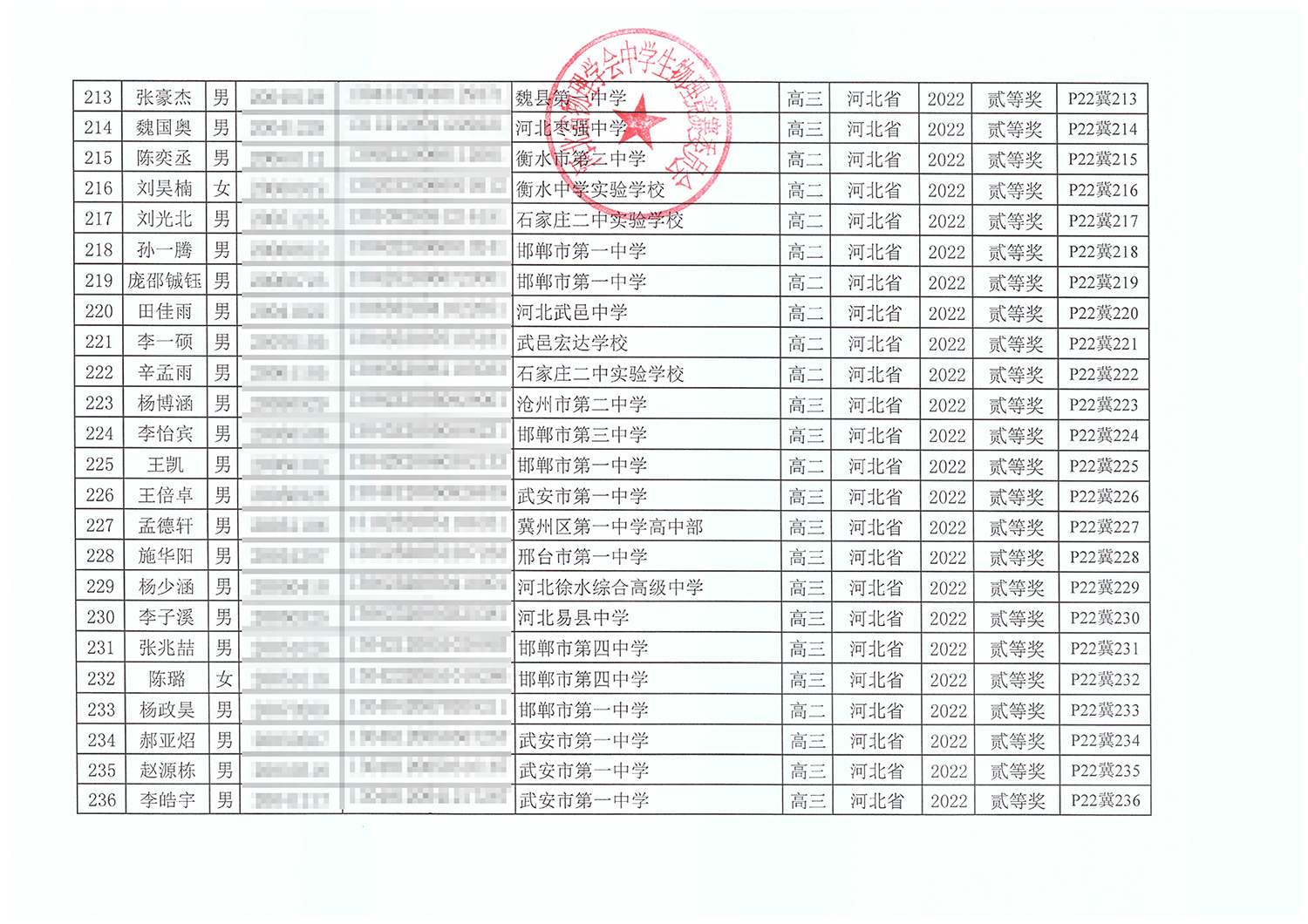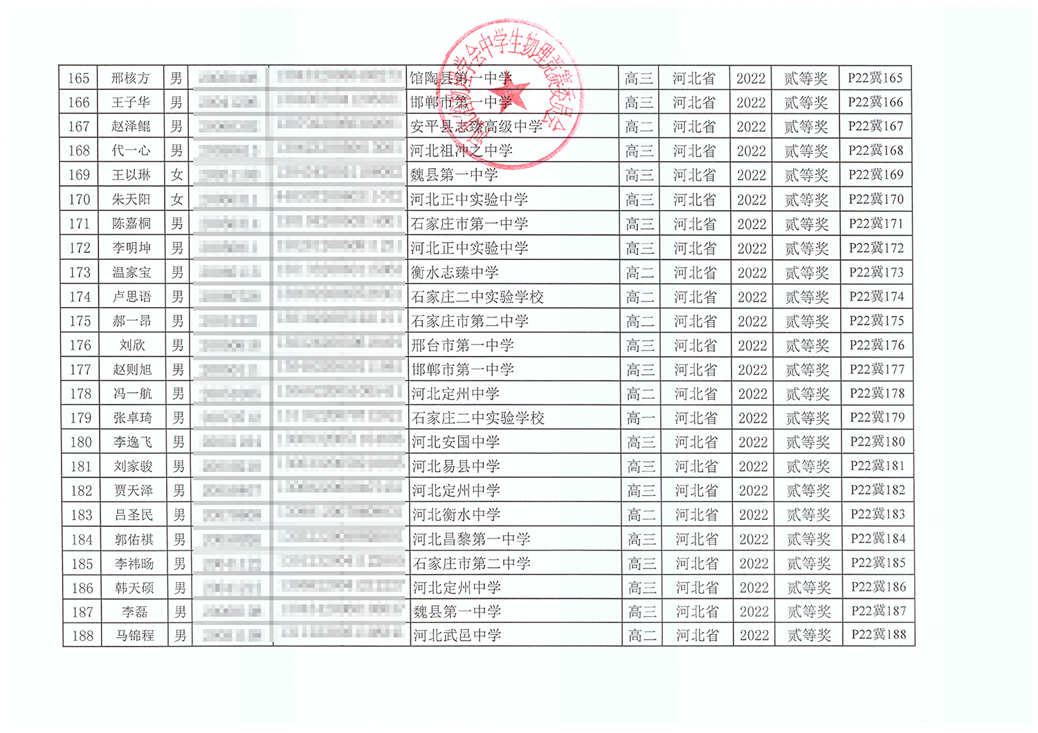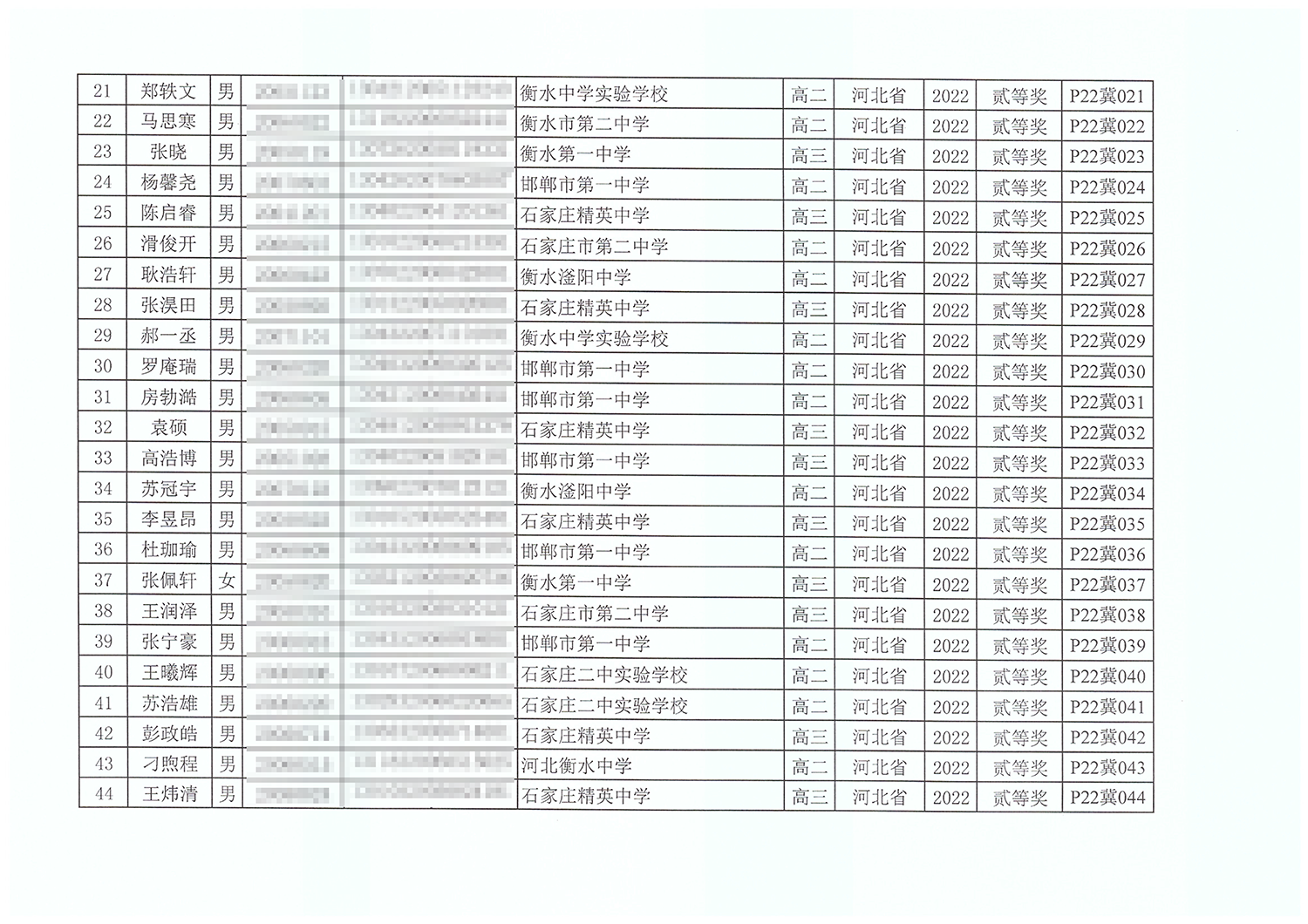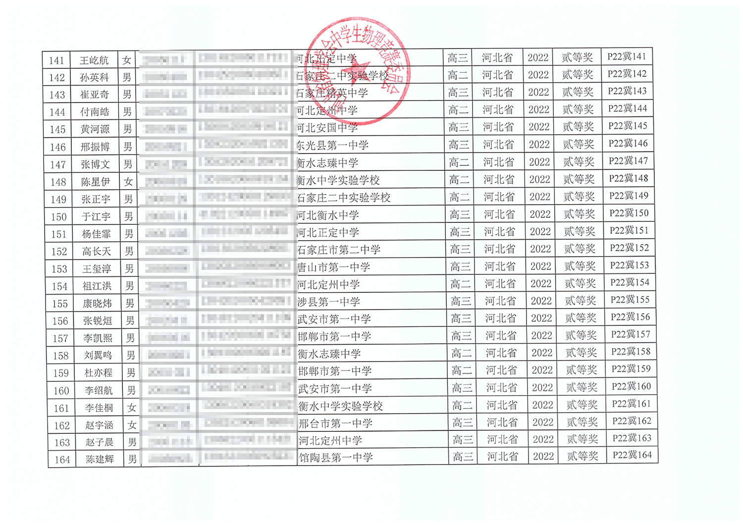 第39届全国中学生物理竞赛河北赛区获奖名单