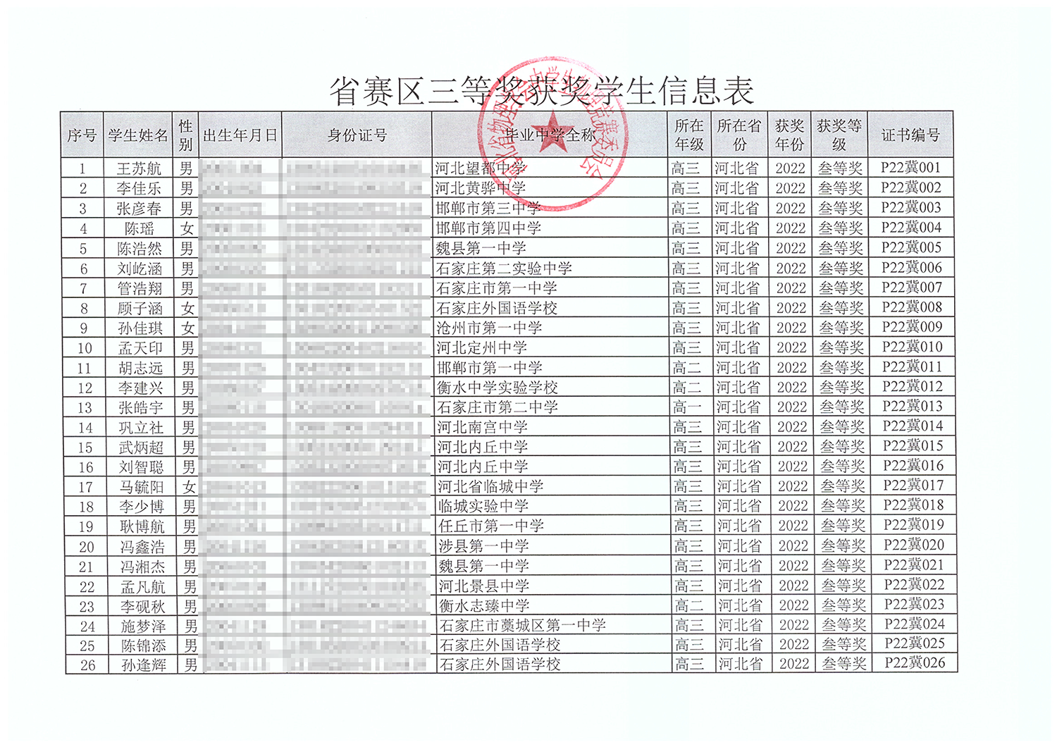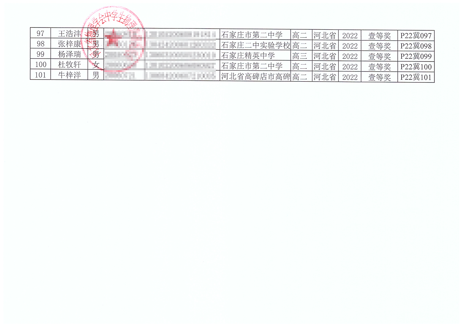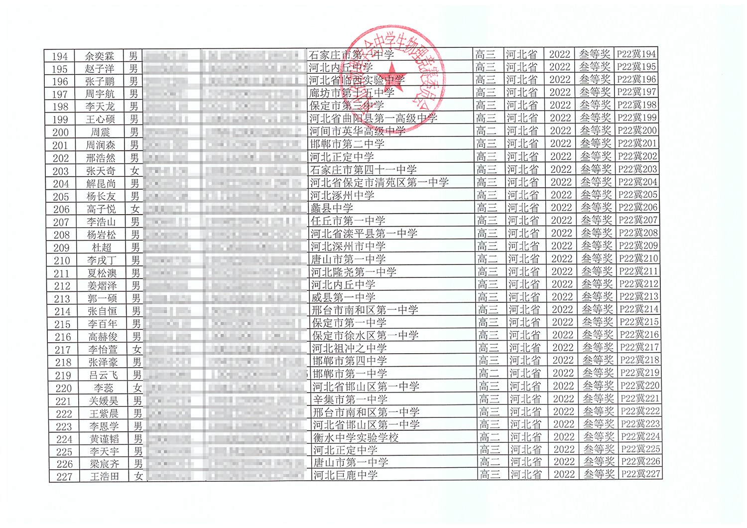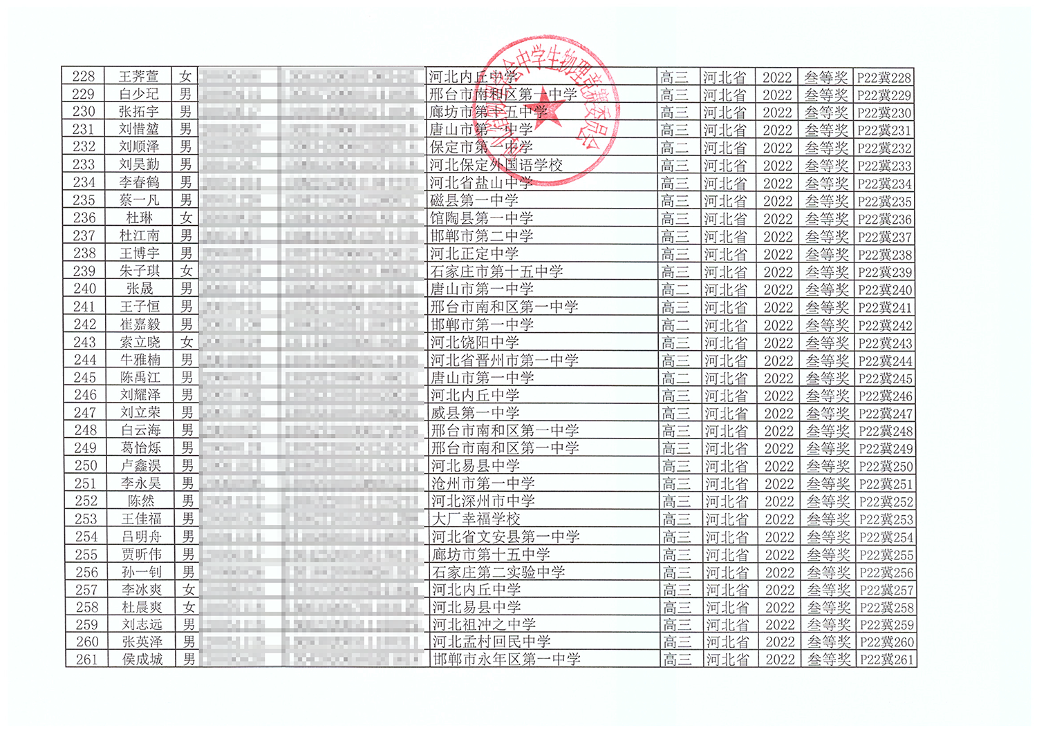 第39届全国中学生物理竞赛河北赛区获奖名单