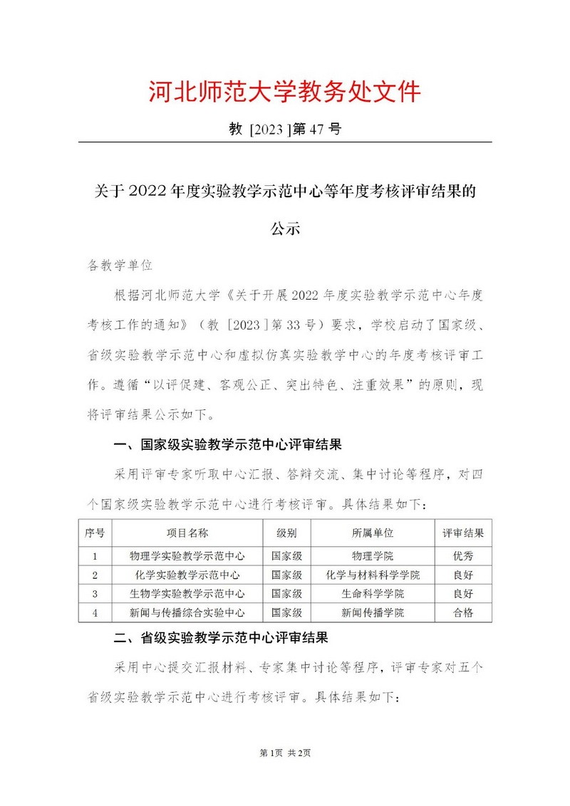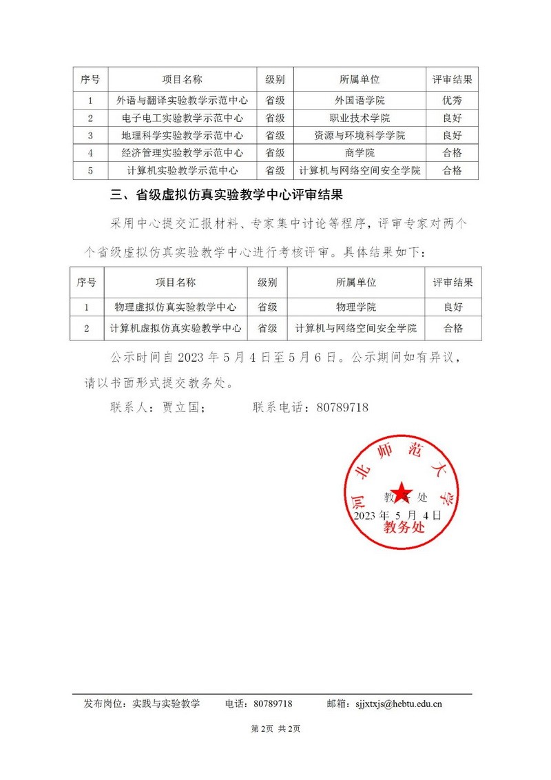 关于2022年度实验教学示范中心等年度考核评审结果的公示