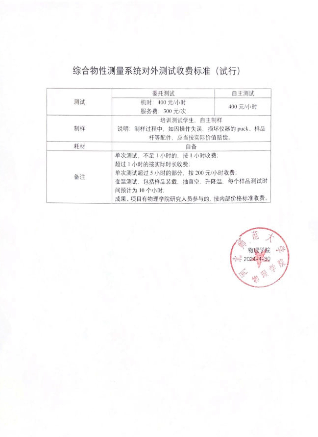 综合物性测量系统对外测试收费标准(试行)