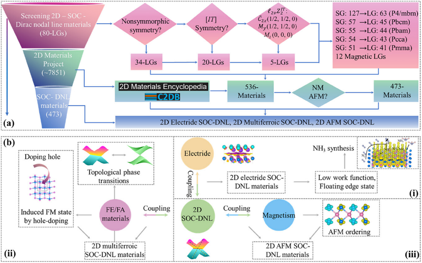 (a) 高通量筛选二维体系中对称性强制形成的Dirac节线材料。(b) Dirac节线和无机电子化合物、多铁性和磁性耦合形成的独特系统。