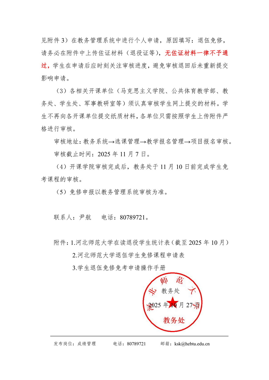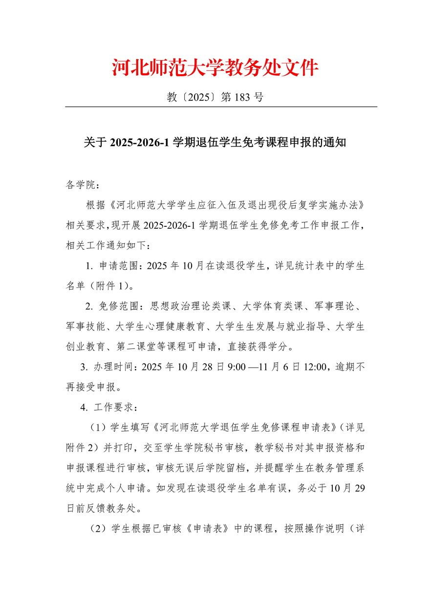 关于2025-2026-1学期退伍学生免考课程申报的通知